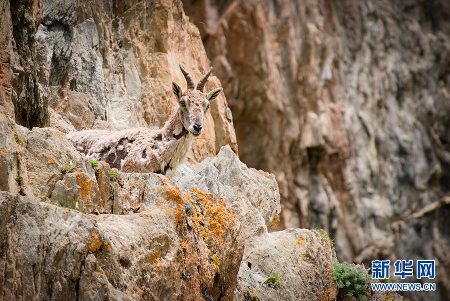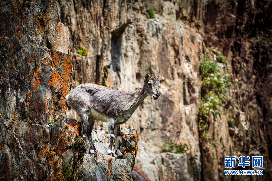 一只巖羊站在巖壁上眺望。新華網 宋忠勇 攝