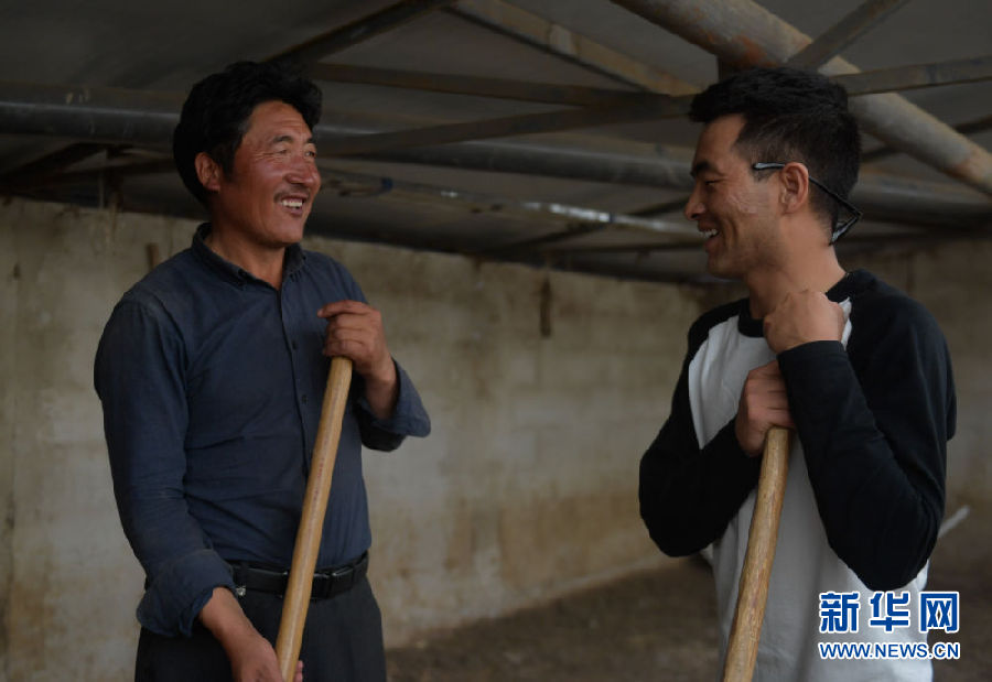 8月13日,尤拉太(左)和父親尕藏本在自家的羊圈內(nèi)交談。新華社記者 張宏祥 攝