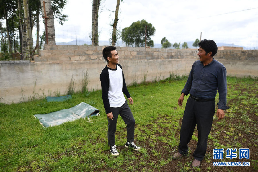 8月13日,在夏塘村,尤拉太(右)與父親在干活間歇聊天。新華社記者 張龍 攝