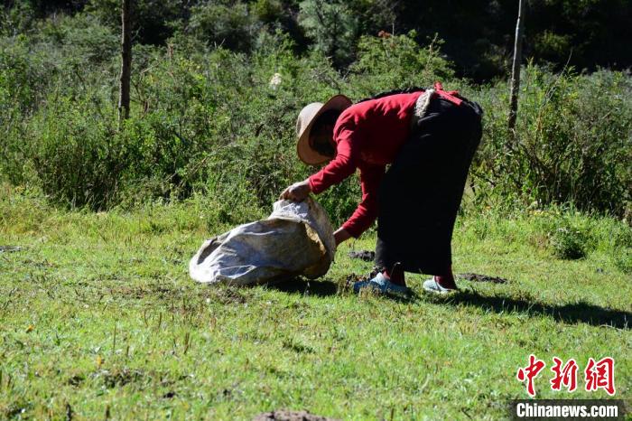 工人在拾撿牛糞。 壤塘融媒體供圖