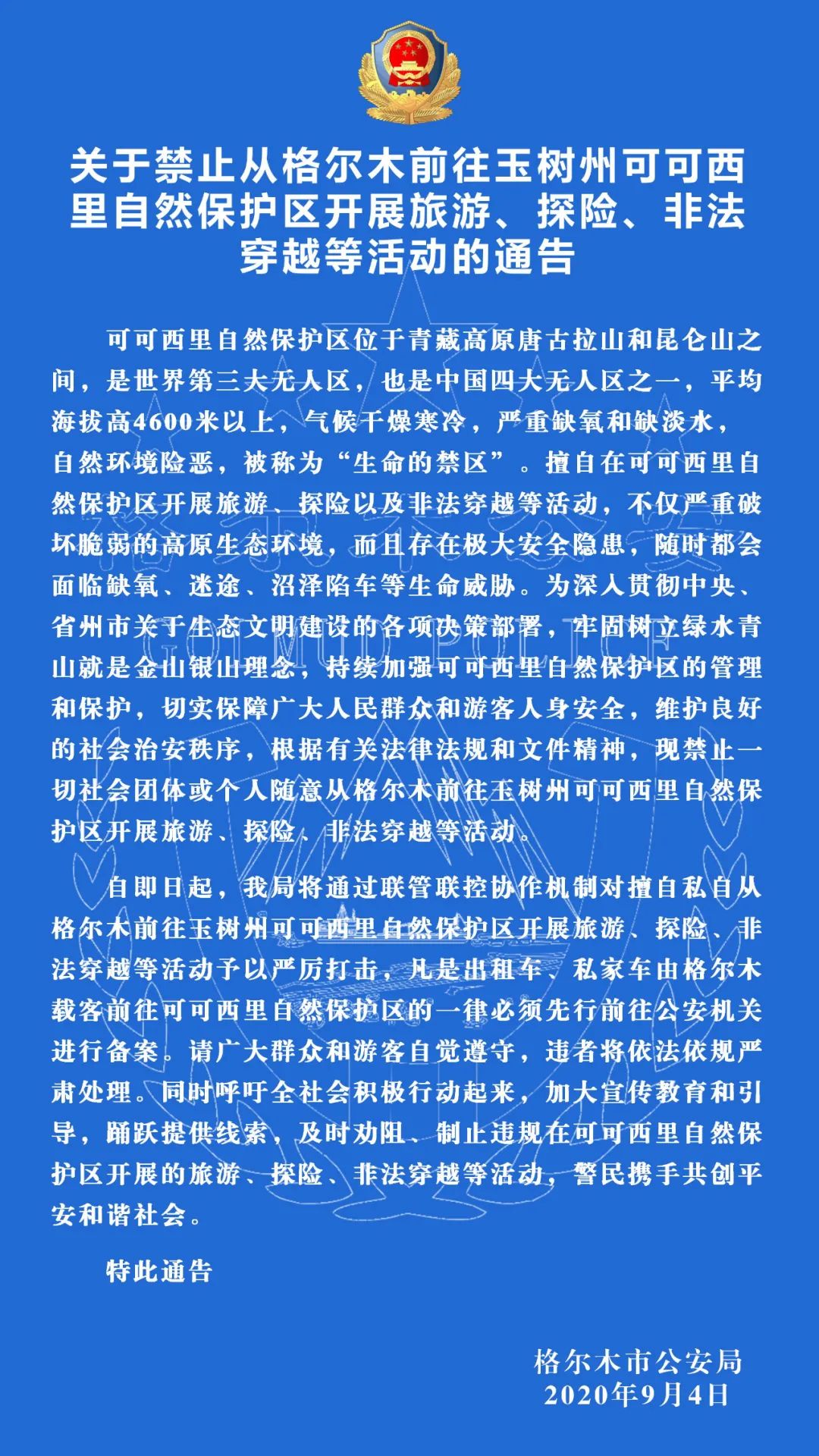 據(jù)格爾木公安微信公眾號(hào)消息,9月4日,青海省格爾木市公安局發(fā)布通告,禁止一切社會(huì)團(tuán)體或個(gè)人隨意從格爾木前往玉樹州可可西里自然保護(hù)區(qū)開展旅游、探險(xiǎn)、非法穿越等活動(dòng),即日起將對(duì)上述行為予以嚴(yán)厲打擊,凡是出租車、私家車由格爾木載客前往可可西里自然保護(hù)區(qū)的一律必須先行前往公安機(jī)關(guān)進(jìn)行備案。