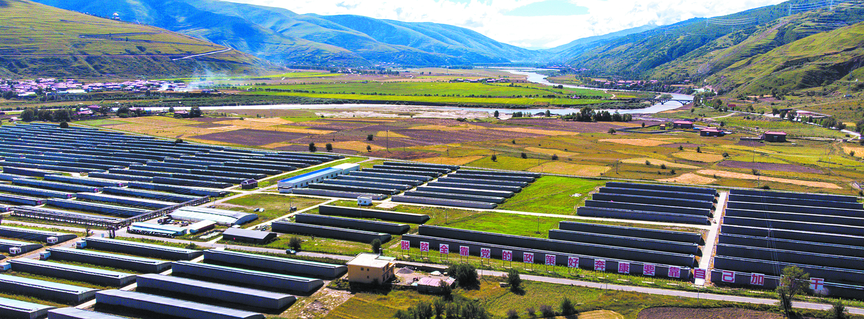湛藍的天空中漂浮著片片白云,靜靜的鮮水河在一座座披著綠色盛裝的大山間流淌,河谷的開闊地帶,一座座蔬菜大棚整齊地排列著,遠遠望去,猶如披上綠裝的蒙古包,連綿不斷,與湛藍的天空交相輝映。