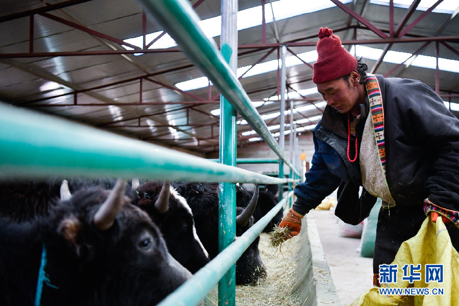 青海省黃南藏族自治州澤庫(kù)縣寧秀鄉(xiāng)拉格日村牧民多杰才旦在合作社的牛棚里喂牛(2019年1月17日攝)。新華社記者 張龍 攝