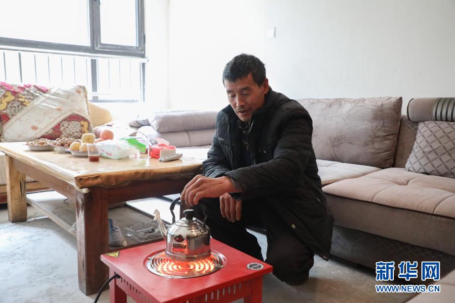12月2日,在舟曲縣曲告納鎮(zhèn)田園生態(tài)小區(qū)易地扶貧搬遷集中安置點,曲告納鎮(zhèn)茶坪村扎尕組村民在臨時安置的房屋內(nèi)煮茶。新華社記者 馬希平 攝