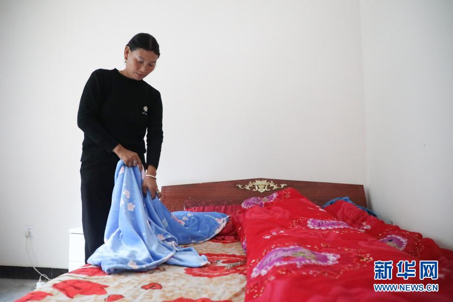 12月2日,在舟曲縣曲告納鎮(zhèn)田園生態(tài)小區(qū)易地扶貧搬遷集中安置點,曲告納鎮(zhèn)茶坪村扎尕組村民在臨時安置的房屋內(nèi)疊被子。新華社記者 馬希平 攝