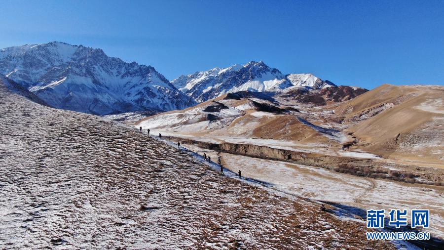 12月8日,祁連山國家公園扎麻什管護(hù)站生態(tài)管護(hù)員在巡護(hù)途中(無人機照片)。新華社記者 張宏祥 攝