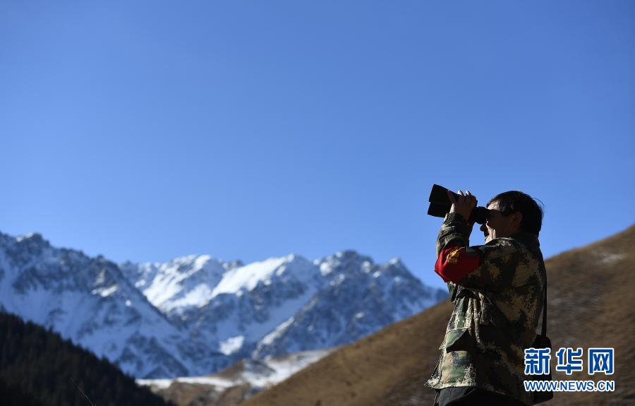12月8日,祁連山國家公園扎麻什管護(hù)站生態(tài)管護(hù)員周曲才郎巡查途中使用望遠(yuǎn)鏡。新華社記者 張宏祥 攝