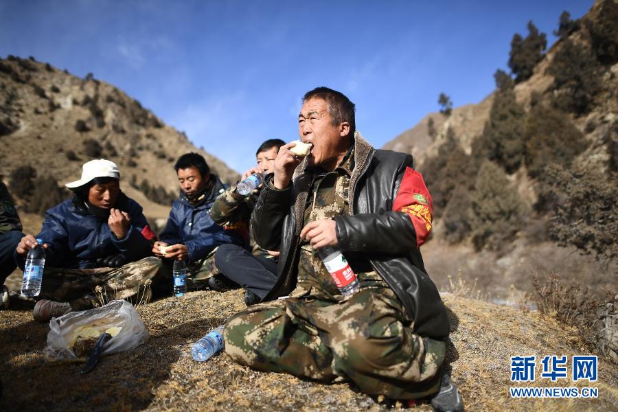 12月8日,祁連山國家公園扎麻什管護(hù)站生態(tài)管護(hù)員昂毛什加(右一)和同伴在吃午餐。新華社記者 張宏祥 攝