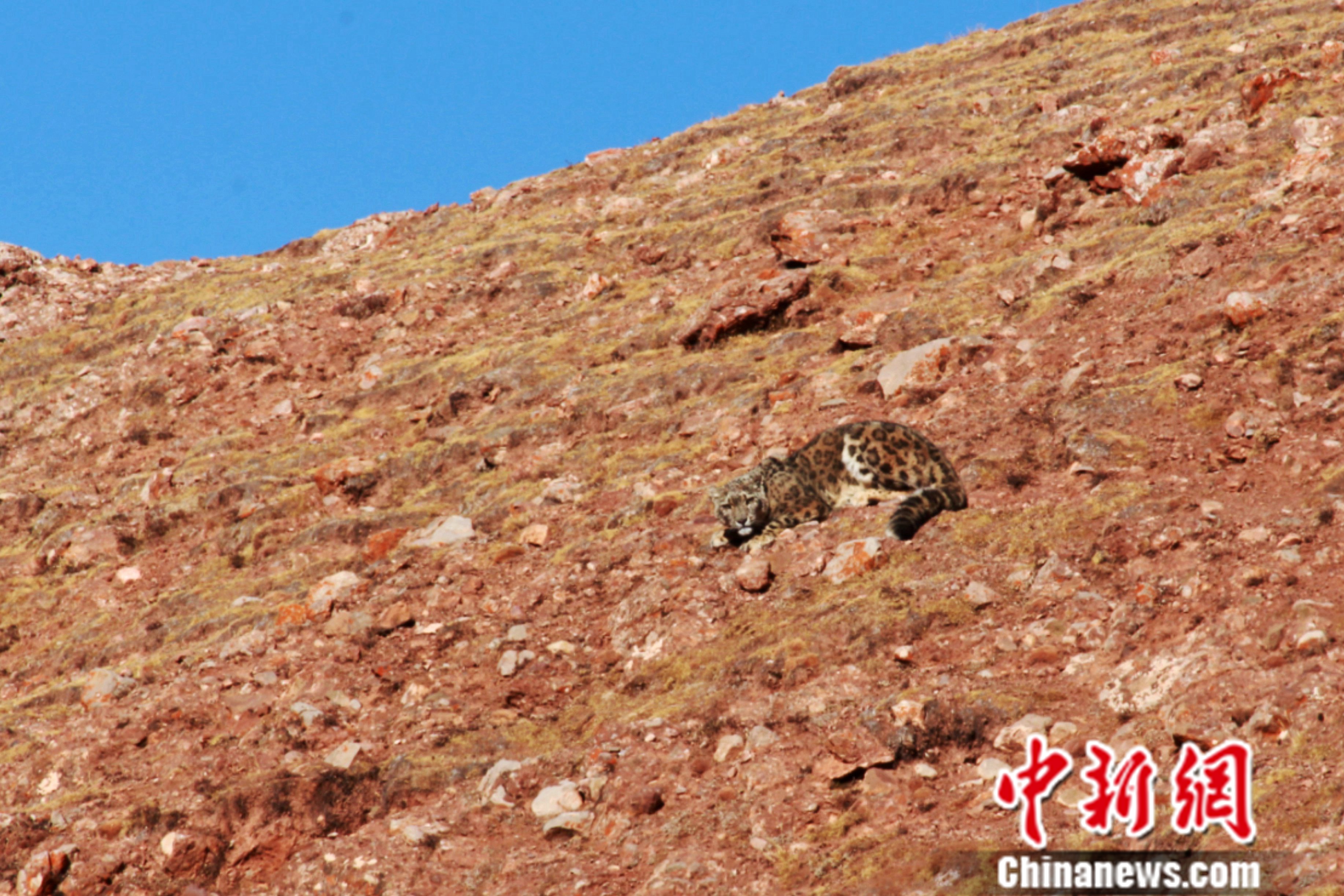 中新社記者看到,羅松扎西拍攝的動(dòng)物臥在山坡上,酷似雪豹,但其皮毛顏色跟金錢豹接近,即呈現(xiàn)棕黃色,遍布斑點(diǎn)和環(huán)紋。