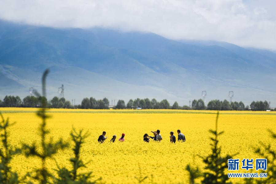 7月22日,游客在青海門(mén)源回族自治縣的油菜花田中拍照。新華社記者 吳剛 攝