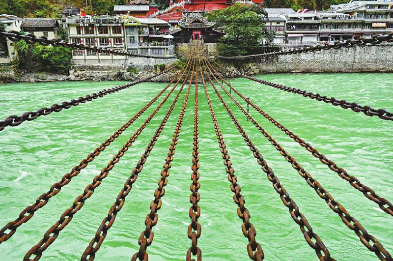 瀘定橋始建于清康熙四十四年(1705年),是大渡河上建造最早最長的一座橋梁,橋身由十三根鐵鏈組成,下邊九根作為底鏈,兩邊四根作為扶手,橋長101.67米,橋?qū)?米,由12164個鐵環(huán)組成,十三根鐵鏈重達21噸。