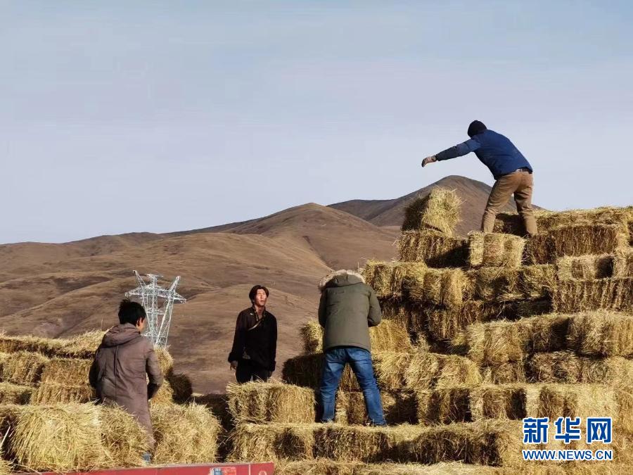 在青海省果洛藏族自治州甘德縣江千鄉(xiāng),牧民在搬運飼草(2020年11月3日攝)。新華社記者 解統(tǒng)強 攝