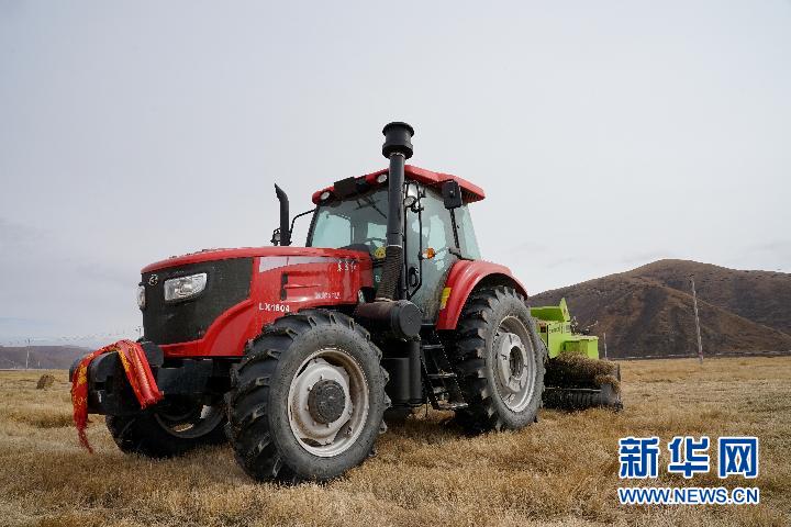 在青海省果洛藏族自治州甘德縣江千鄉(xiāng),牧民在飼草基地駕駛打捆機作業(yè)(2020年11月3日攝)。新華社記者 陳凱 攝