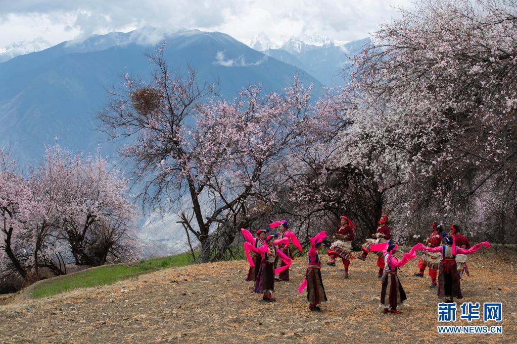 4月4日,在得榮縣徐龍鄉(xiāng)徐堆村,藏族群眾在桃花林下表演當(dāng)?shù)馗栉琛X(jué)央彈唱。新華社記者 江宏景 攝