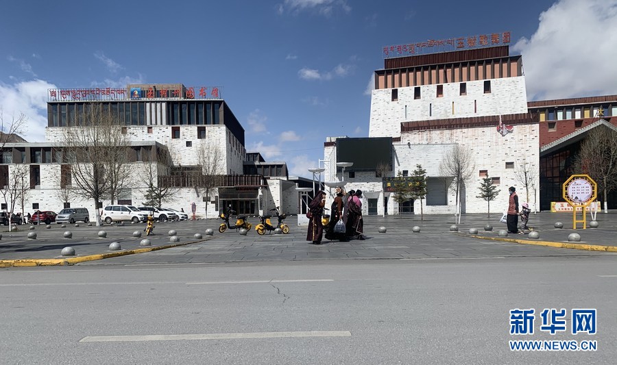 圖為位于玉樹市中心的玉樹州圖書館和玉樹歌舞團。(2021年4月14日攝)新華社記者 李琳海 攝