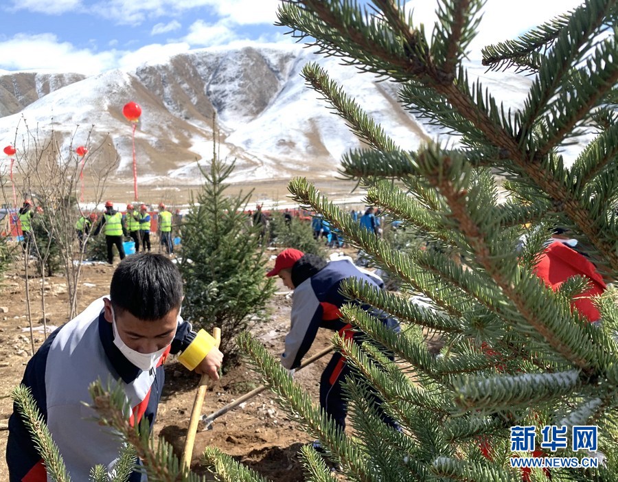 4月14日當天,玉樹舉行植樹活動。圖為當?shù)貙W生在距離玉樹市區(qū)約7公里的山坡植樹。新華社記者 李琳海 攝
