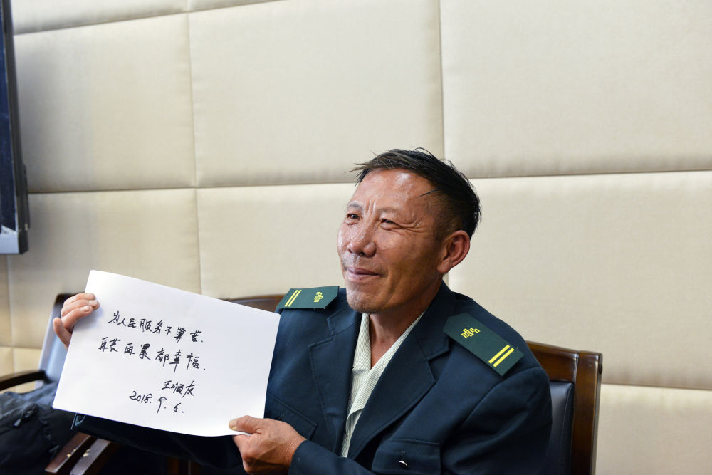 2018年9月6日,王順友寫(xiě)下“為人民服務(wù)不算苦,再苦再累都幸福”(中國(guó)郵政集團(tuán)有限公司四川省分公司供圖)。