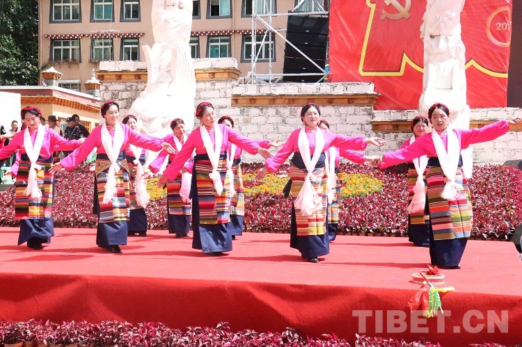 活動現(xiàn)場,黨旗國旗飄揚、哈達傳情,在一片歡騰的海洋里,大家載歌載舞齊唱光輝歲月,放聲歌頌幸福美好生活,盡情抒發(fā)高城兒女的愛黨愛國情懷。歌曲《翻身農(nóng)奴把歌唱》《草原上升起不落的太陽》,穿插吉祥老人頌詞和舞蹈。表達高原兒女在中國共產(chǎn)黨的領(lǐng)導(dǎo)下,翻身獲得解放,掌握了自己的命運。短短幾十年的發(fā)展過程,涉藏州縣迎來騰飛,經(jīng)濟社會發(fā)生了翻天覆地的變化,與祖國同步實現(xiàn)全面小康。