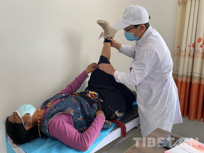 圖為石少輝大夫現(xiàn)場檢查患者癥狀(組委會供圖)