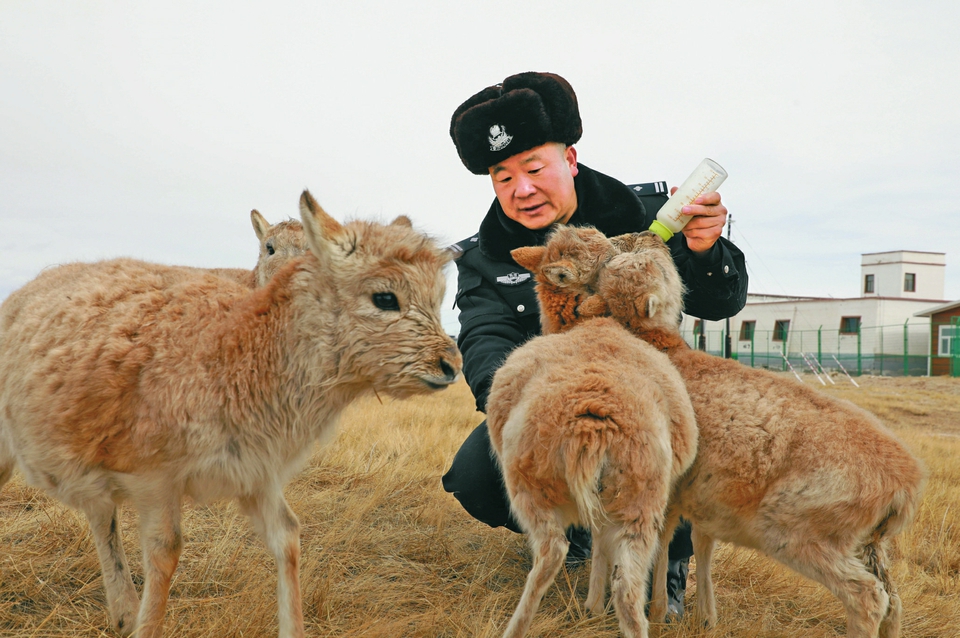 索南達(dá)杰保護(hù)站站長(zhǎng)趙新錄在給藏羚羊幼仔喂奶。新華社發(fā)