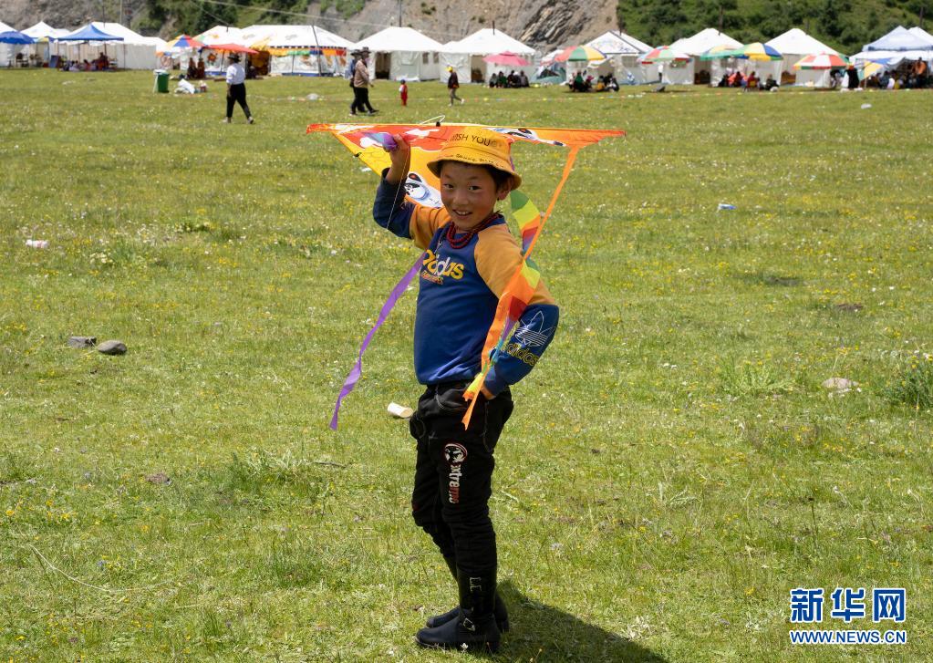 7月22日,小朋友在道孚縣玉科草原上放風箏。新華社記者 劉夢琪 攝