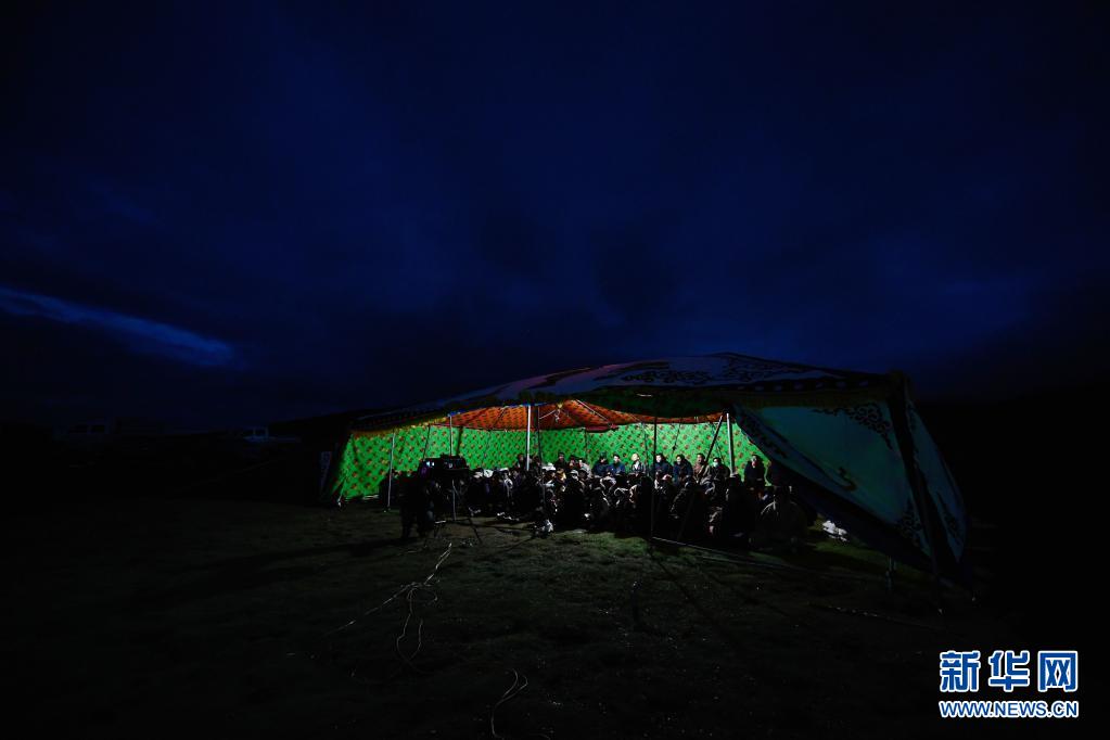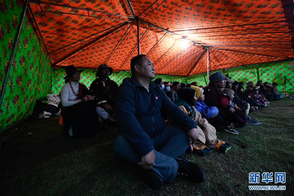 8月3日,在瑪沁縣當(dāng)洛鄉(xiāng)貢龍村的夏季草場上,南拉才讓(前排左一)和牧民一起看電影。新華社記者 張龍 攝