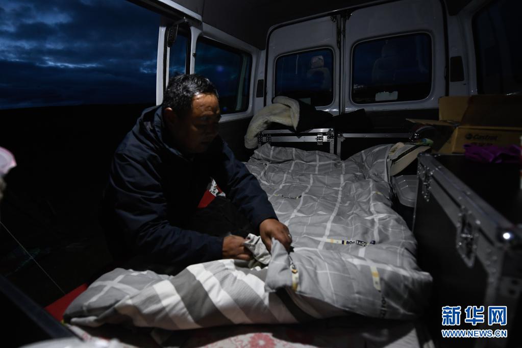 8月3日,在瑪沁縣當(dāng)洛鄉(xiāng)貢龍村的夏季草場上,南拉才讓在放映車中整理床鋪。每次到草原上放電影,南拉才讓都睡在車?yán)?。新華社記者 張龍 攝