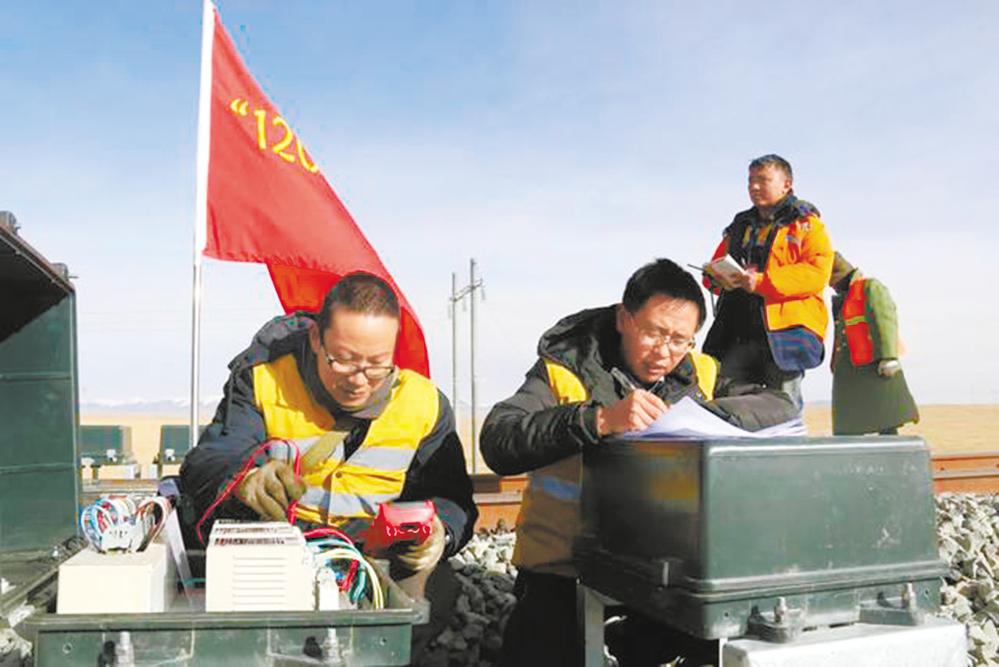 格爾木信號車間黨支部隊員正在進行軌道電路檢修。格爾木信號車間供圖