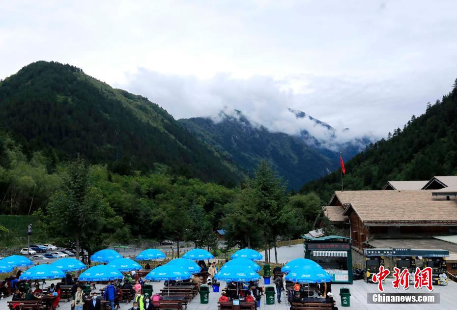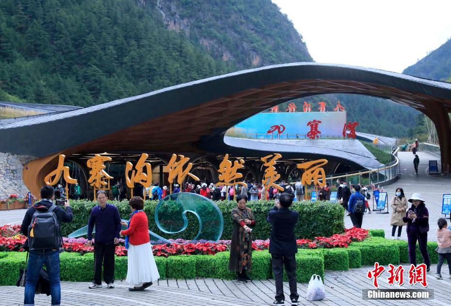 圖為9月27日,四川阿壩,游客在九寨溝門前拍照留影。王磊 攝