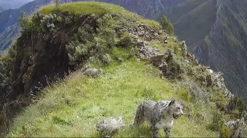 據(jù)了解,雪豹出現(xiàn)的地方距離曲麻萊縣城大概80公里左右,視頻中,雪豹媽媽先是出現(xiàn)在了鏡頭前面,過了一會之后,兩只小雪豹從草叢中“躡手躡腳”跑了出來,樣子十分可愛,隨后在雪豹媽媽的帶領(lǐng)下,三只雪豹消失在了鏡頭前。當?shù)厣鷳B(tài)環(huán)境部門工作人員告訴記者,除了這次紅外相機拍攝到雪豹蹤跡,在前段時間,距離三只雪豹出現(xiàn)三十多公里的地方,還拍攝到了另一只在夜間活動的雪豹,畫面中這只雪豹嘴里叼著獵物,背對著走過紅外相機鏡頭。