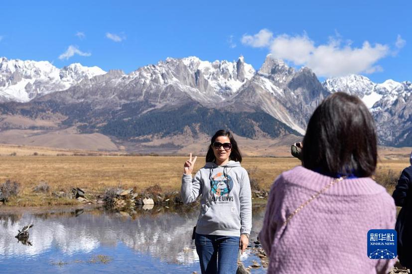 游客在四川甘孜巴塘縣措普溝景區(qū)內拍照留念(10月24日攝)。新華社記者 胥冰潔 攝