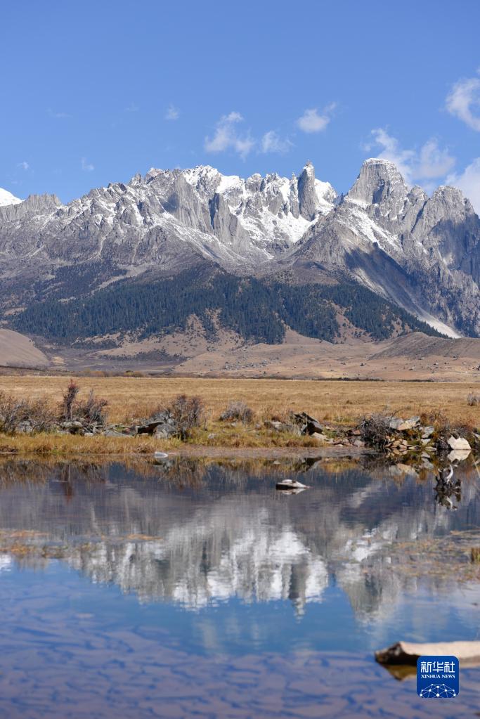 這是10月24日在措普溝景區(qū)內拍攝的章德草原和扎金甲博神山。新華社記者 劉坤 攝
