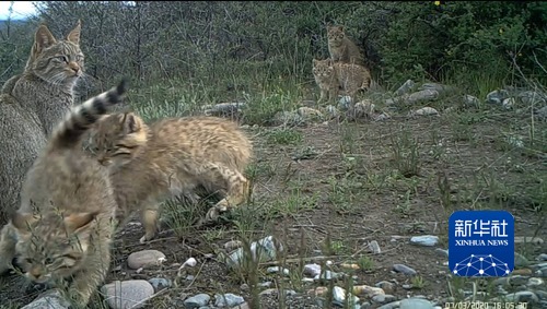 這是布設(shè)在祁連山國(guó)家公園青海片區(qū)的紅外相機(jī)拍攝到的5只荒漠貓同框畫面(2020年7月3日攝)。新華社發(fā)(祁連山國(guó)家公園青海省管理局供圖)