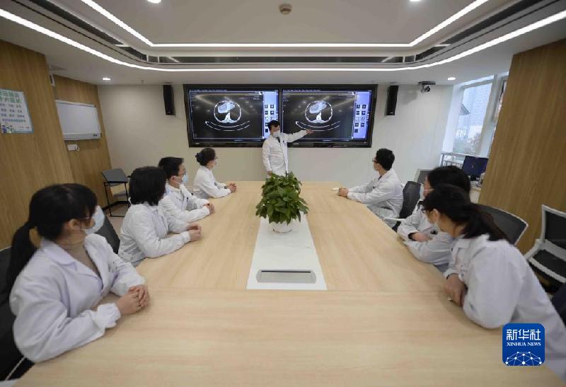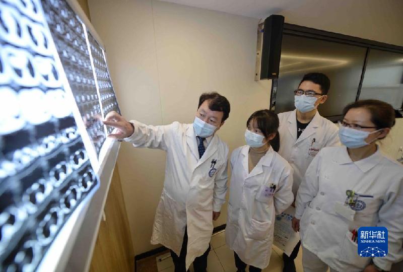 12月3日,在四川大學(xué)華西醫(yī)院,王文濤(右四)在與醫(yī)務(wù)人員討論病人治療方案。新華社記者 劉坤 攝