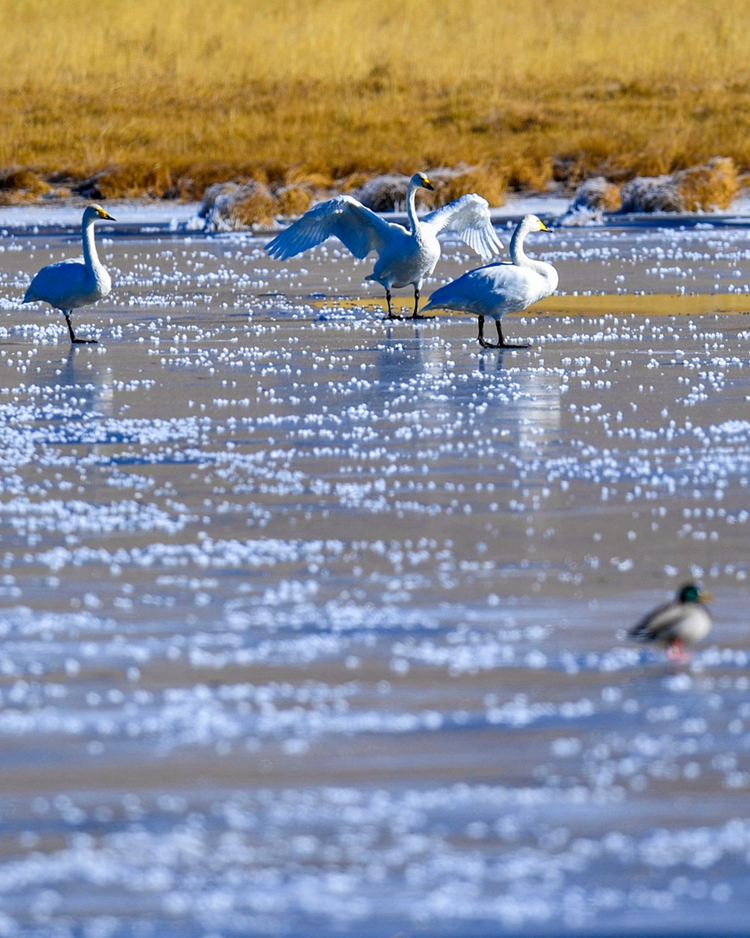 入冬以來(lái),甘肅省甘南藏族自治州碌曲縣尕海濕地越冬的大天鵝浴雪歡歌,翩翩起舞,成為草原上一道獨(dú)特的風(fēng)景。