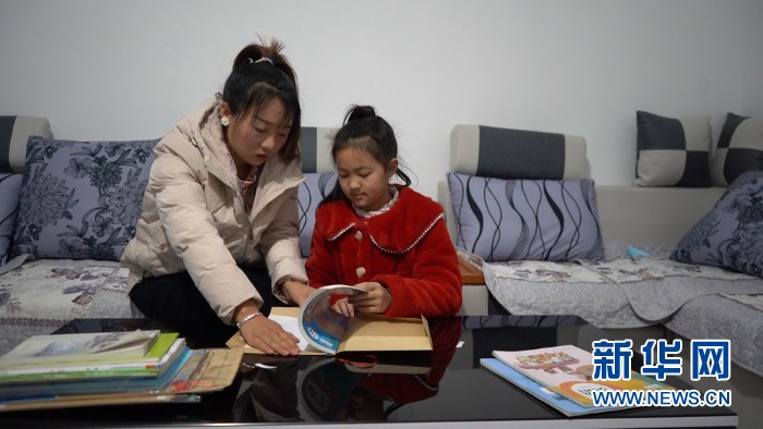 21日晚,尚欣怡和媽媽薛淑琴在新家一起包書皮。新華社記者 郎兵兵 攝