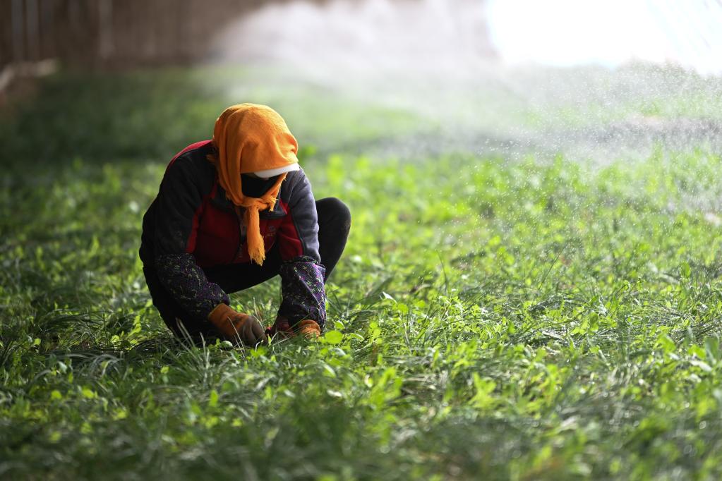 3月23日,藥農在青海省海西蒙古族藏族自治州德令哈市柯魯柯鎮(zhèn)的藏紅花大棚內除草。新華社記者 張龍 攝