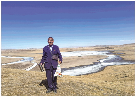 圖為多杰老人和他身后的關(guān)秀濕地。王浡 攝