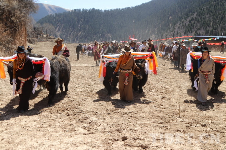 農(nóng)牧民群眾身穿節(jié)日盛裝,相聚在農(nóng)田里,端著預(yù)示豐收的黑青稞,捧著潔白的哈達(dá),牽著耕牛,開著輪式拖拉機(jī)齊聚田間地頭舉行開耕歡慶儀式。