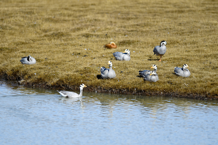 在三江源國(guó)家公園黃河源園區(qū)內(nèi)拍攝的一群斑頭雁。新華社記者 李占軼 攝
