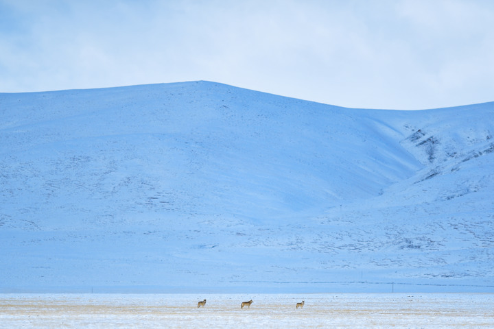 在三江源國(guó)家公園黃河源園區(qū)內(nèi)拍攝的三匹狼。新華社記者 張龍 攝