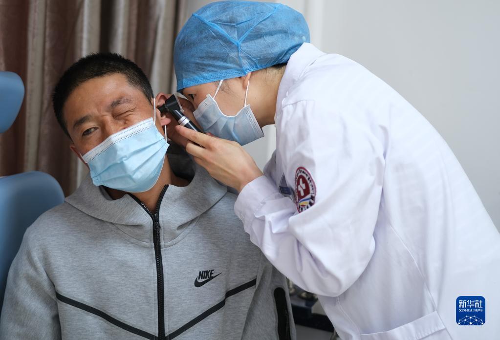 4月25日,青海省人民醫(yī)院醫(yī)生、青南支醫(yī)隊(duì)員王菲在青海省玉樹藏族自治州人民醫(yī)院給患者進(jìn)行檢查。新華社記者 韓方方 攝