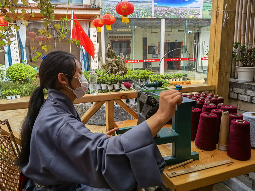 2022年5月12日,“5·12”汶川特大地震抗震救災(zāi)14周年紀(jì)念日,山鷹帶著幾個(gè)員工來(lái)到漁子溪,在汶川縣黨委、映秀鎮(zhèn)黨委、漁子溪村兩委及當(dāng)?shù)厝罕姷臒崆閹椭?,舉辦了“藍(lán)措馬”品牌圍巾展示活動(dòng)。村里還積極幫助他們尋找合適的房屋作為編織車間,讓他們先在漁子溪站住腳。