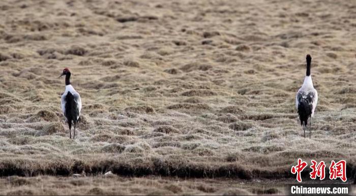 圖為兩只黑頸鶴在濕地中悠閑踱步。天峻縣融媒體中心 供圖