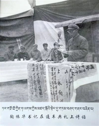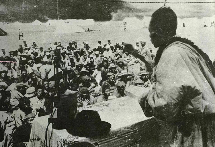 圖為1952年8月工作團(tuán)在達(dá)日縣查郎寺召開果洛頭人、代表聯(lián)誼會(huì)議,扎喜旺徐團(tuán)長在聯(lián)誼會(huì)議上作有關(guān)民族團(tuán)結(jié)的報(bào)告。圖片由央金提供