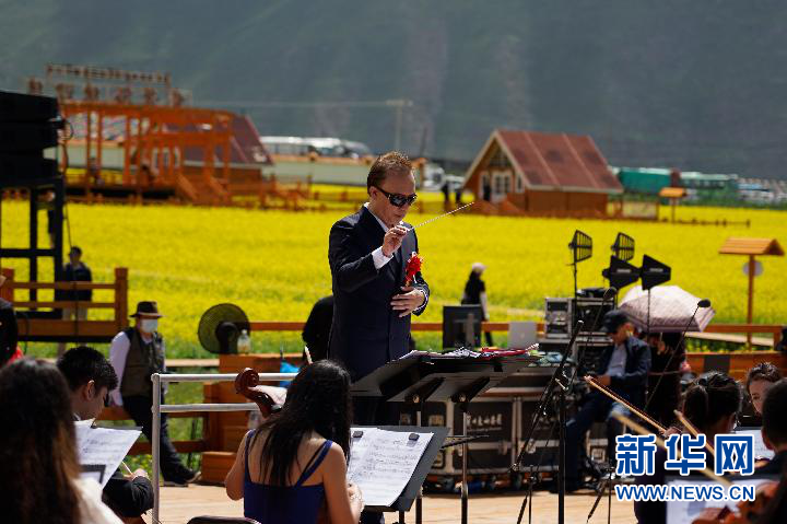 在海拔約3000米的油菜花海中,世界名曲、中國(guó)民歌依次奏起,花如海,樂(lè)如浪,音樂(lè)在山谷中回響。