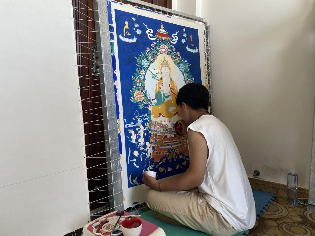 為唐卡上色。人民網(wǎng) 況玉 攝