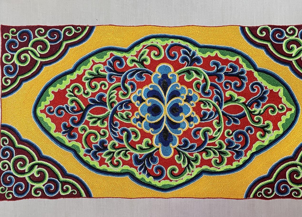“目前我主要是在做建筑彩繪,我想把這些圖案都運用到我們的建筑當中,熱貢藝術(建筑彩繪)也就能更好地傳承下去了?!备窃诓世L創(chuàng)作中融入了清代旋子畫法和明代和璽畫法,形成了自己獨特的彩繪風格,曾設計并完成了甘肅省政府及水銀樓兩個項目的彩繪工程。