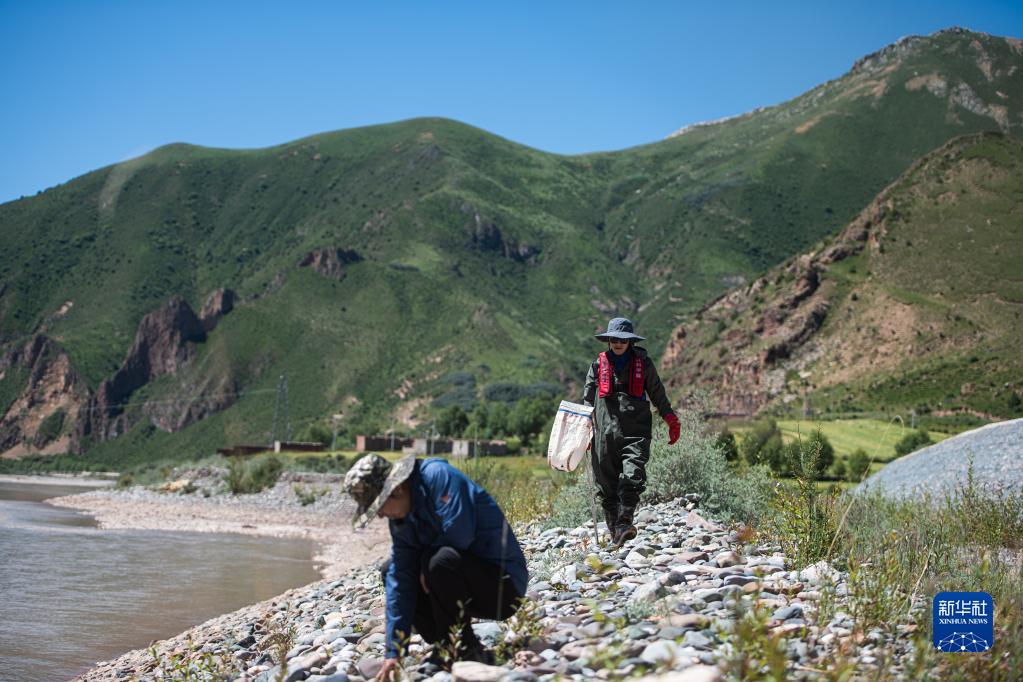 7月24日,長(zhǎng)江科學(xué)院科考隊(duì)員李魯?shù)ぃㄓ遥┡c劉晗在瀾滄江源區(qū)的扎曲采集底棲動(dòng)物樣本。新華社記者 肖藝九 攝