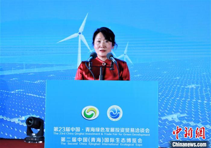 圖為海南州政府副州長獨金萍進行投資環(huán)境說明推介。 顏軍 攝
